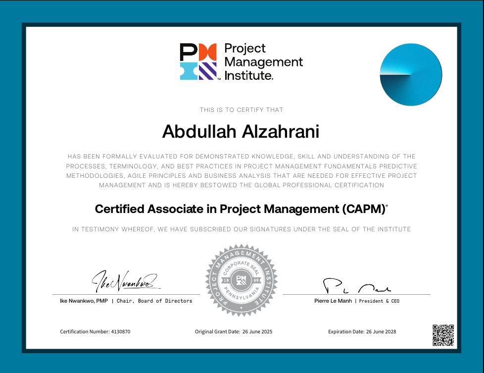 As an engineering student, I collaborated on multiple course projects, developing strong decision-making and teamwork skills. I’m also CAPM-certified and currently pursuing the PMP certification.